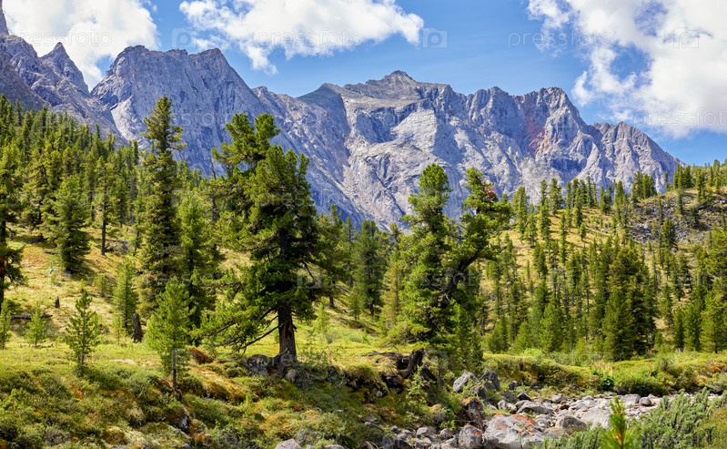 Сибирские сосны в горной долине возле хребта