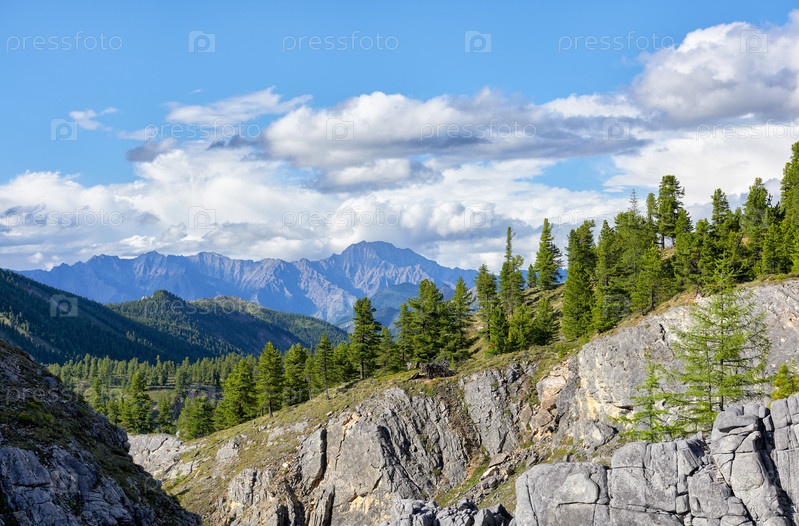 Горный склон, заросший сибирскими кедрами в прекрасный летний день. Горная тайга. Восточный Саян. Бурятия