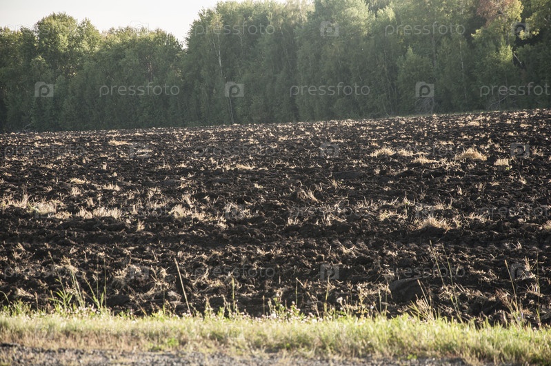 Сельскохозяйственное поле, на котором были вспаханы борозды для посадки картофеля. Весна. голубое небо