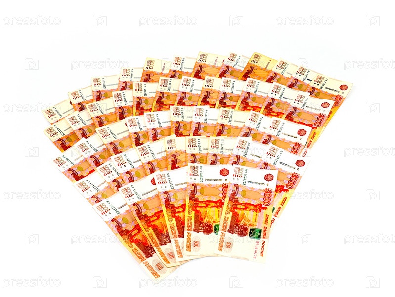 Веерообразная стопка бумаги пятитысячных банкнот российского рубля