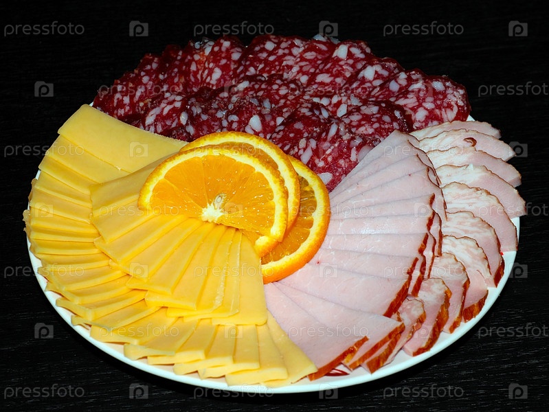 Нарезанные кусочки сырокопченой колбасы и карбоната лежат на тарелке с сыром