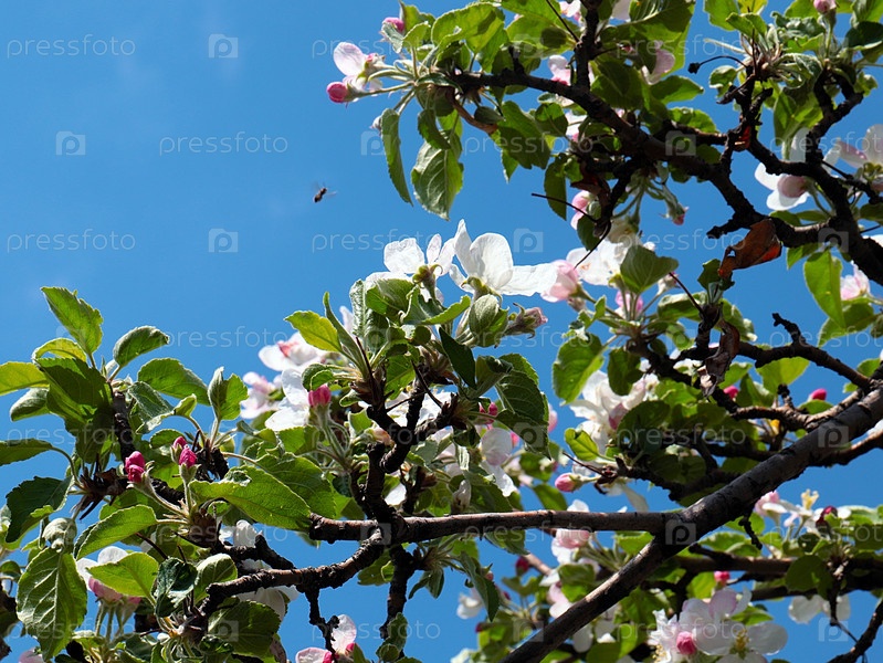 Красивые свежие бело-розовые цветки на ветвях весенней яблони