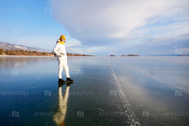 Портрет улыбающегося спортсмена с фигурными коньками на замерзшем озере Байкал