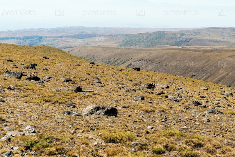 Камни на склоне горы Арагац и вид на ущелье