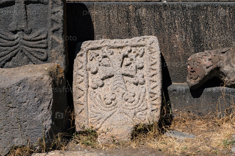 Армения, Амберд, сентябрь 2022 г. Старые плиты с крестами у стены церкви