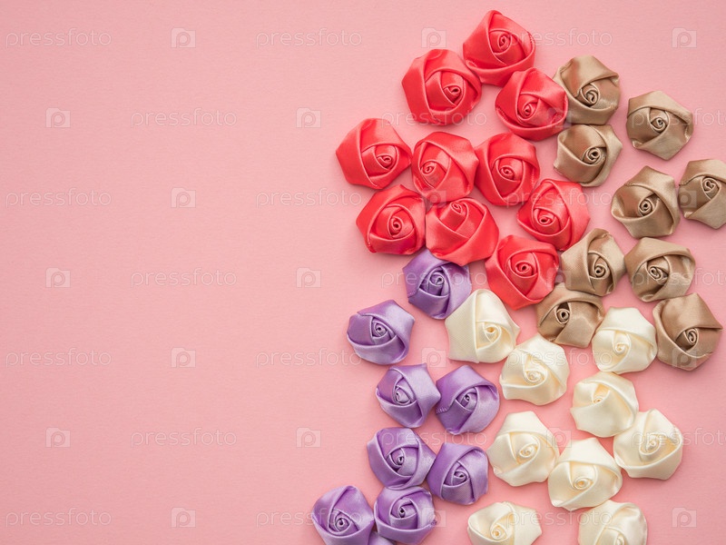 Атласно-розовые, красные, кремовые и коричневые цветы на розовом фоне с копией пространства, вид сверху. Хобби и рукоделие фон