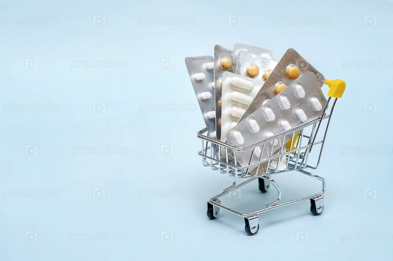 Фармацевтические таблетки в блистерной упаковке в мини-корзине на синем фоне. Концепция интернет-покупок в аптеке