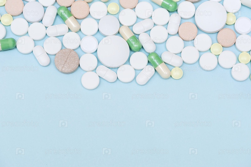 Разные таблетки на синем фоне , место для текста