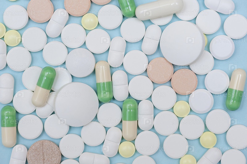 Различные таблетки на синем фоне. Фон из теблеток