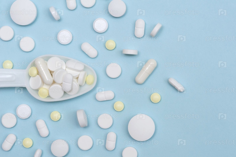 Концепция профилактики и лечения заболеваний. Различные витамины и пищевые добавки в белой ложке на синем фоне