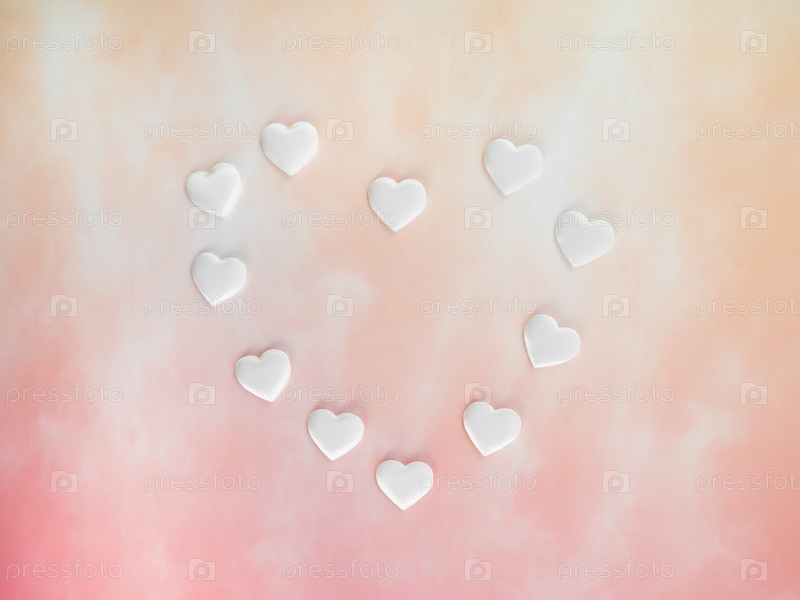 Белые декоративные сердечки на оранжевом и коралловом градиентном фоне, вид сверху. Праздничный любовный фон