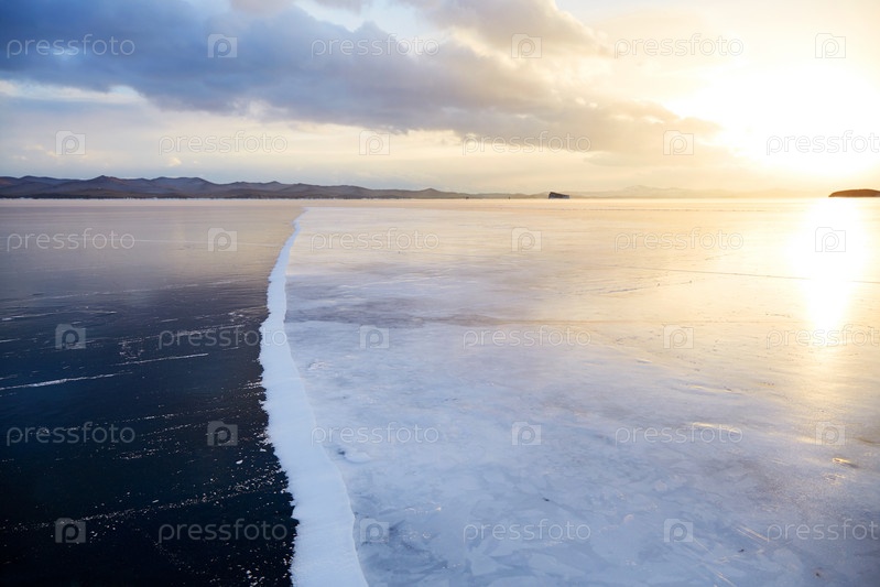 Красивый закат на замерзшем озере Байкал