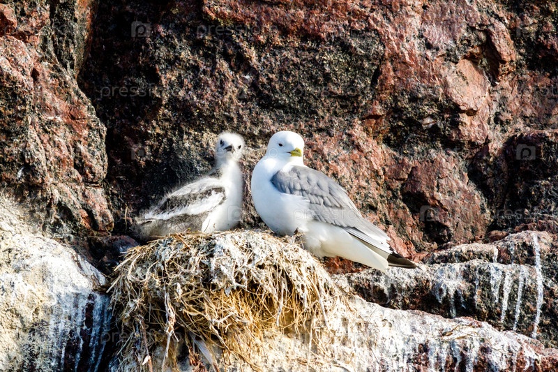 Колония чаек, место обитания птиц и их птенцов Баренцево море, Северный Ледовитый океан, Кольский полуостров, Россия