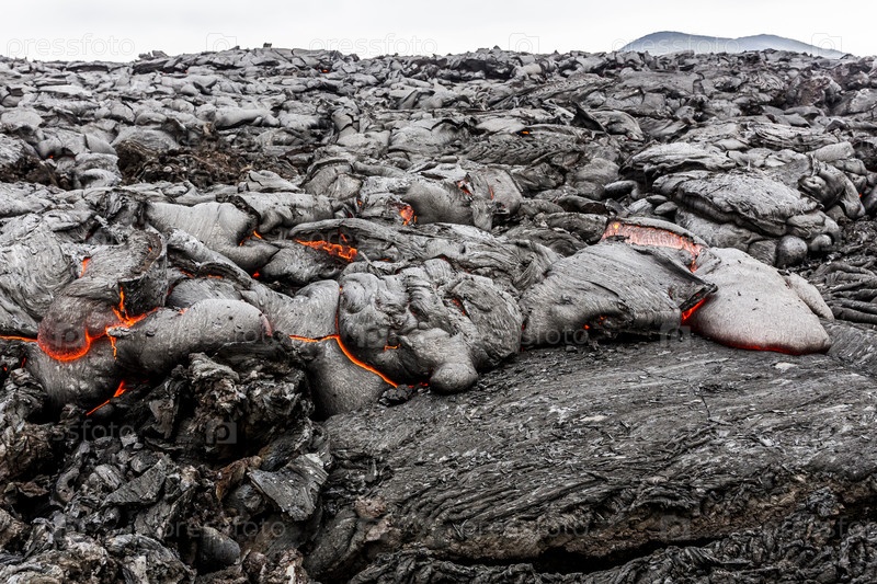 Вулканический пейзаж с кипящей лавой, извержение вулкана Камчатский полуостров, Россия