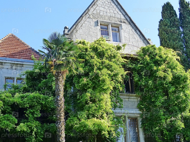 Дворцовое имение Харакс, стилизованный под шотландское шале дворец покрыт красной черепичной крышей. Фасад здания едва виден из-за пальм и лиан. Южный берег Крыма