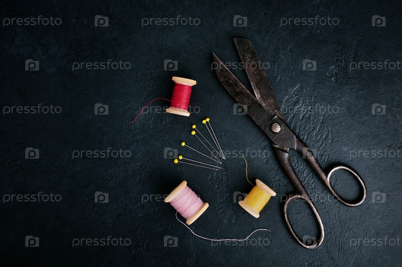 Старинные ржавые портные ножницы и нитки на черном фоне, вид сверху