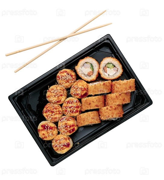 Запеченные роллы с морепродуктами на белом фоне, восточная кухня