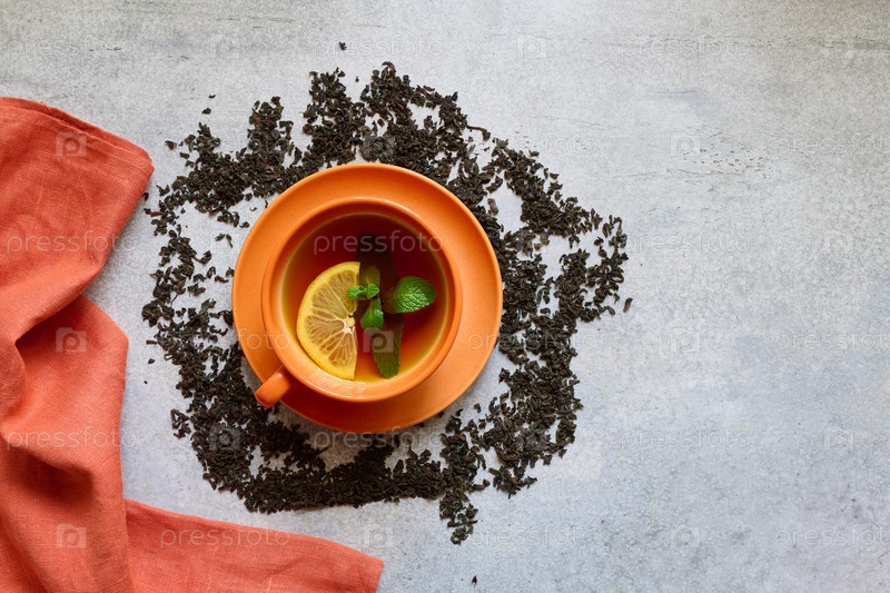 Чашка чая, лимон и мята и льняная салфетка на сером бетонном фоне с местом для текста, вид сверху