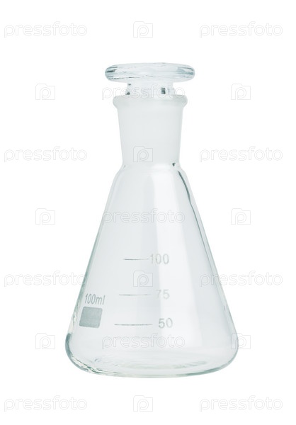 Пустая лабораторная колба с крышкой на белом фоне
