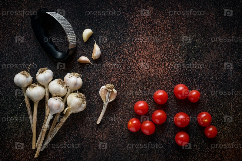 Зубчики чеснока, помидоры черри и пресс для чеснока на темном фоне с копией пространства