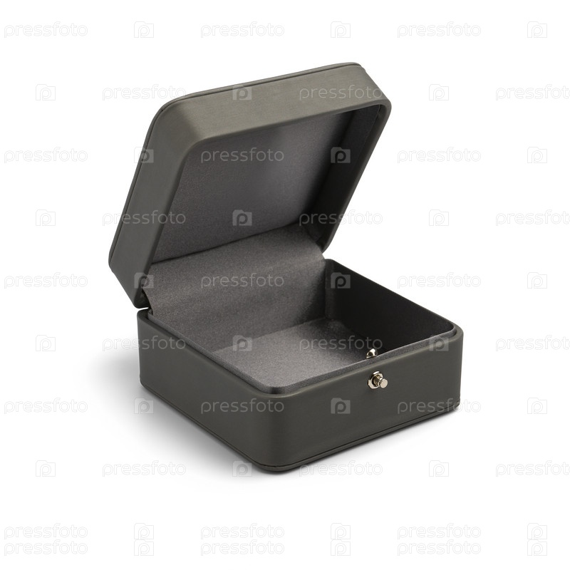 Стильная открытая серая подарочная коробка на белом фоне крупным планом, малая глубина резкости