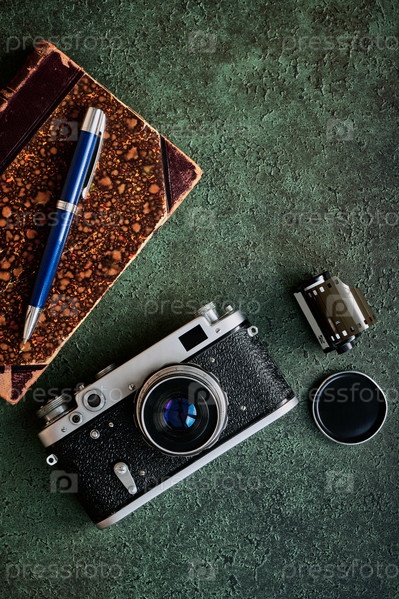 Винтажная камера, старая книга, фотопленка и ручка на темно-зеленом фоне, вид сверху