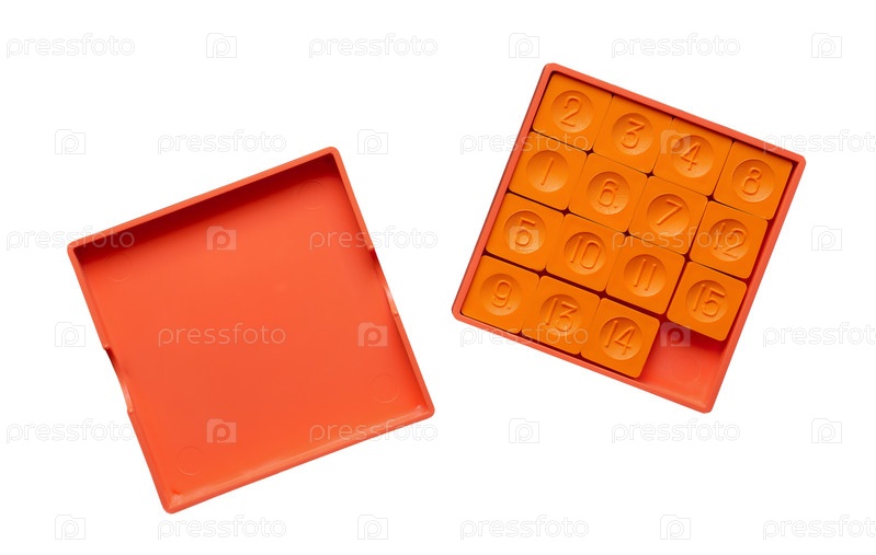 Карманная раздвижная головоломка с пятнадцатью фишками, изолированными на белом фоне крупным планом