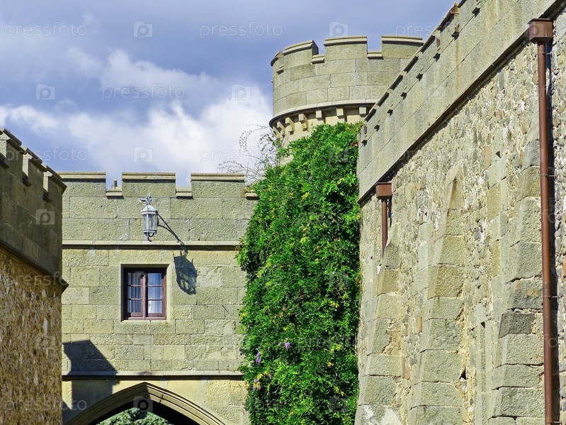 Воронцовский (Алупкинский) дворец — памятник романтизма, построенный в 1828—1848 годах по проекту известного английского архитектора Эдуарда Блора (1789—1879). Западная въездная башня во дворец. Южный берег Крыма