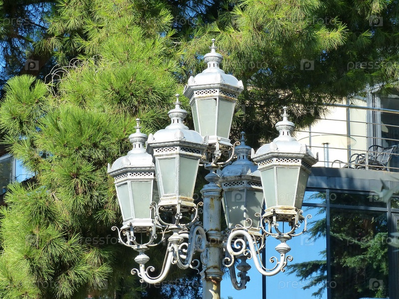 Старый уличный фонарь на фоне вечнозеленых крымских сосен. Прогулка по городу, набережная Ялты