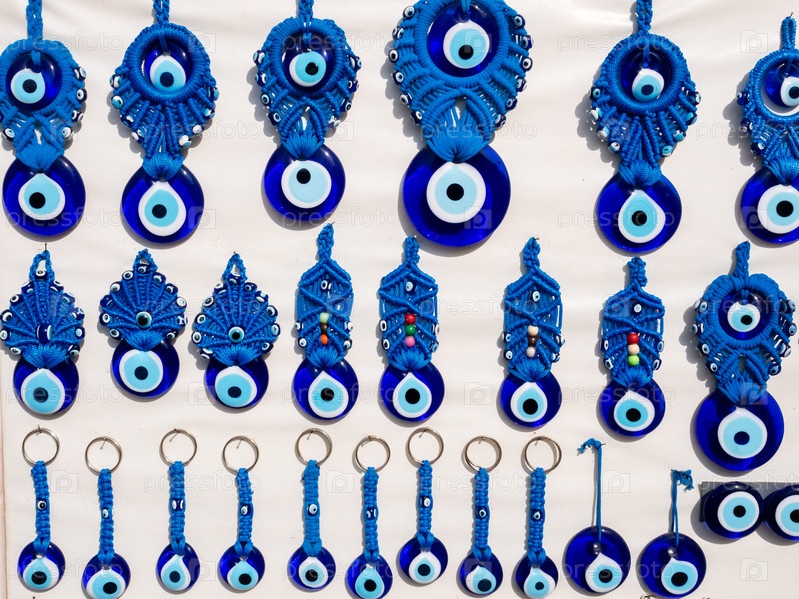 Некоторые сувенирные брелоки с голубым глазом на прилавке уличного рынка в Анталии, Турция