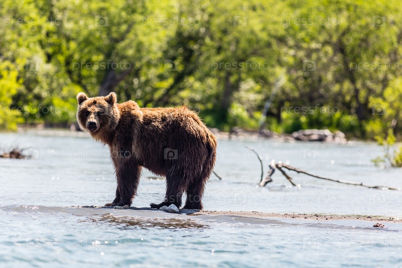 Бурый медведь смотрит в фотокамеру, Курильское озеро, полуостров Камчатка, Россия