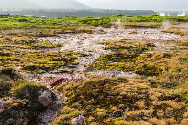 Дымящиеся, серные, активные фумаролы возле Паужетской ГеоЭС, Камчатка, Россия