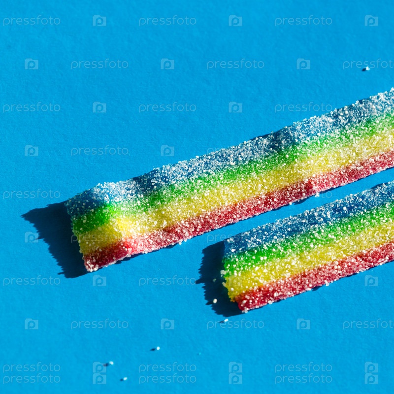 Натуральные мармеладные конфеты радужного цвета на синем фоне. Скопируйте пространство, пустой шаблон для текста