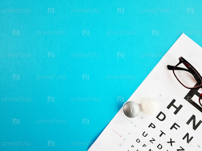 Акулист. Оптические очки и мягкие контактные линзы и офтальмологический стол на синем фоне. Концепция дальнозоркости, близорукости и астигматизма