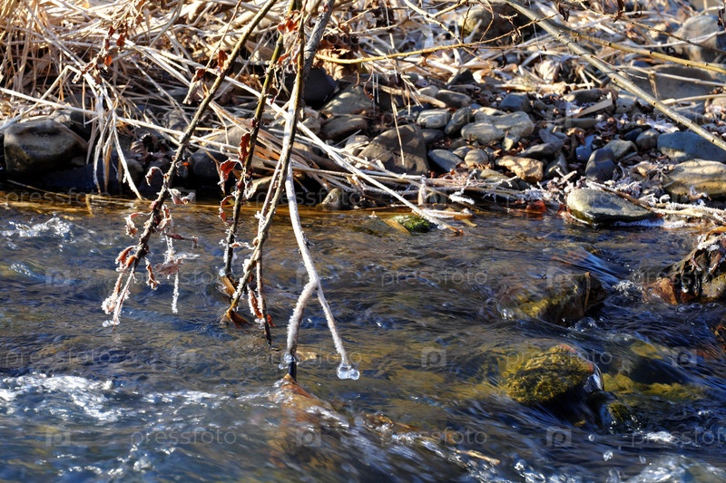 Ледяные веточки с изящными ледяными иглами над текущей водой горного ручья