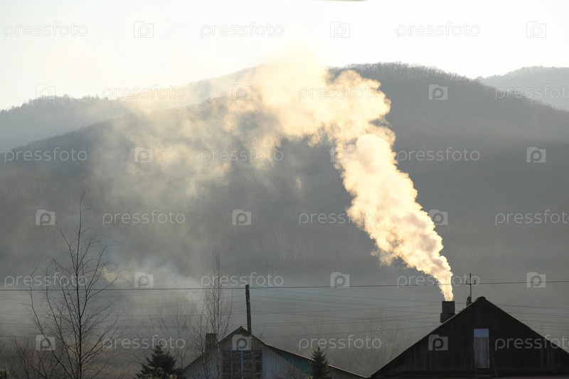 Дым, идущий из трубы в лучах восходящего солнца на фоне гор
