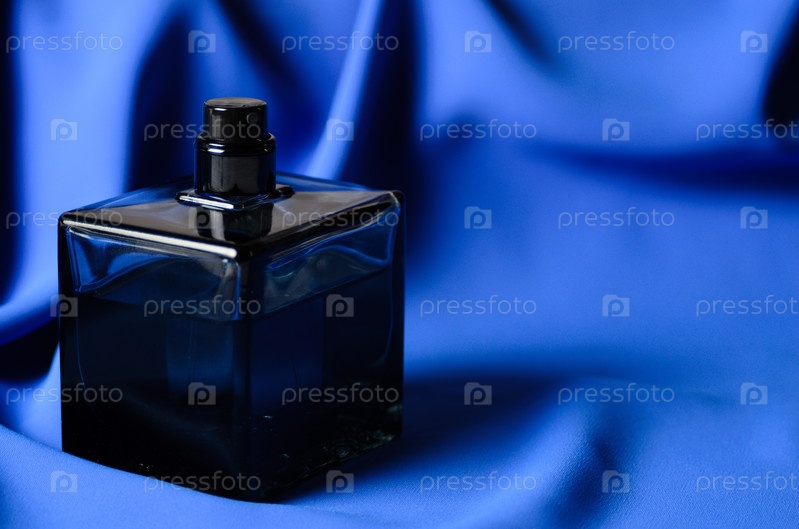 Парфюмерный флакон из черного стекла на волнистом синем фоне