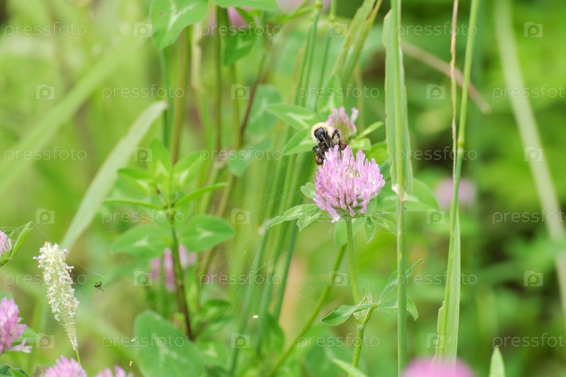 Мохнатый шмель, опыляющий цветок клевера
