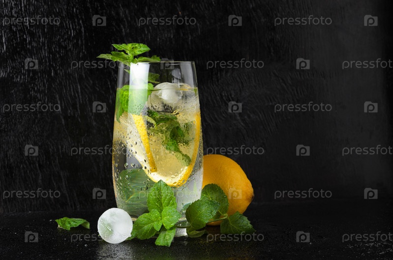 Большой стакан воды с лимоном, листьями мяты и льдом, покрытый каплями воды