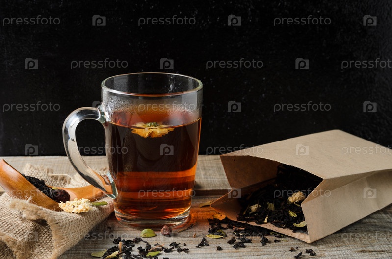 Стеклянная кружка ароматного цветочного чая на деревянном столе, с чайными листьями в бумажной упаковке, в деревенском стиле