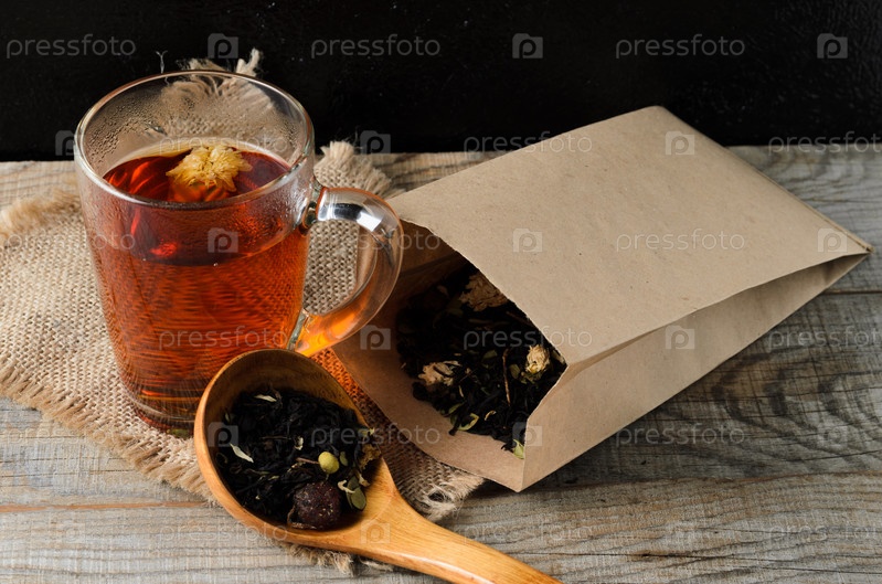 Стеклянная кружка ароматного цветочного чая на деревянном столе с деревянной ложкой
