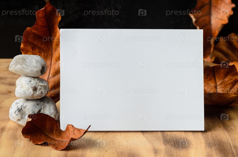 Макет. Белый лист бумаги на деревянной поверхности, окруженный осенними листьями и белыми камнями. Выборочный фокус