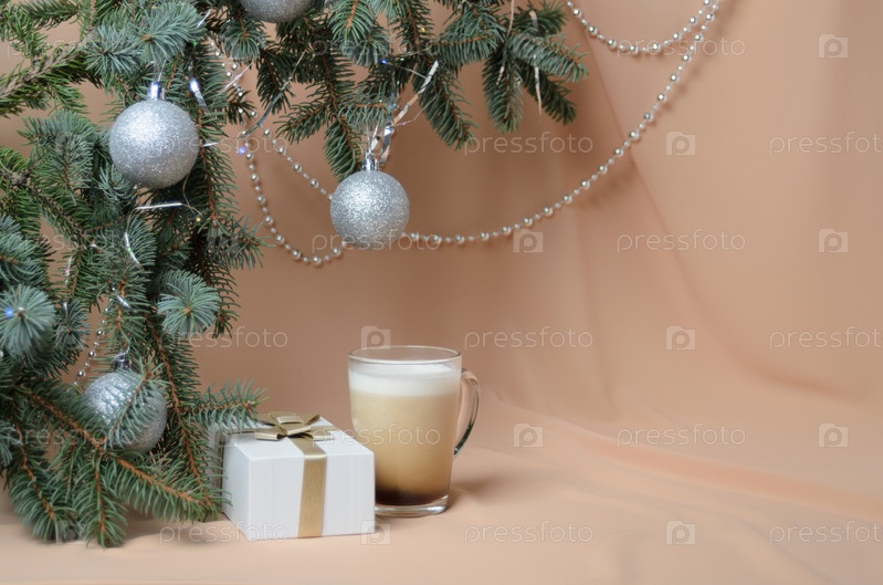 Новогодняя композиция из веток елки, украшенных серебряными шарами, подарочной коробкой, стеклянной кружкой с кофе и молоком на фоне волн телесного цвета. Выборочный фокус