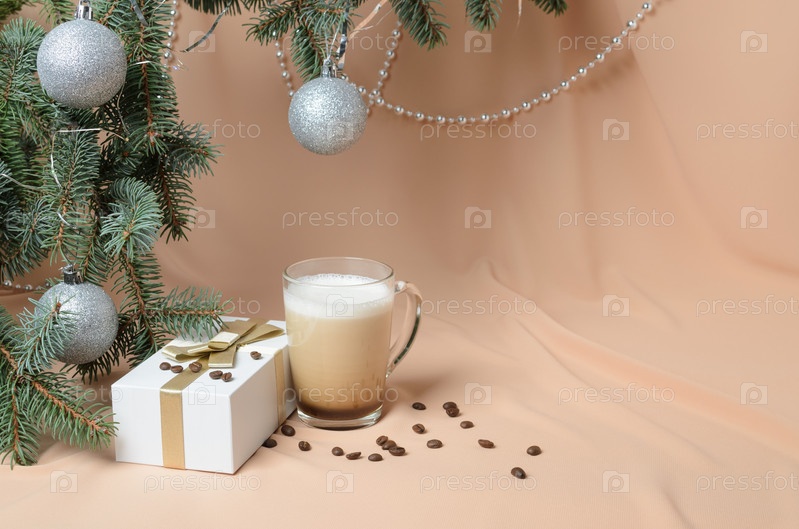 Рождественская елка, украшенная шарами, подарочная коробка, кружка с кофе и молоком на фоне волн телесного цвета