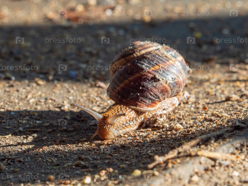 Крупный план виноградной улитки на земле. Бургундская или римская улитка, съедобная ползучая улитка