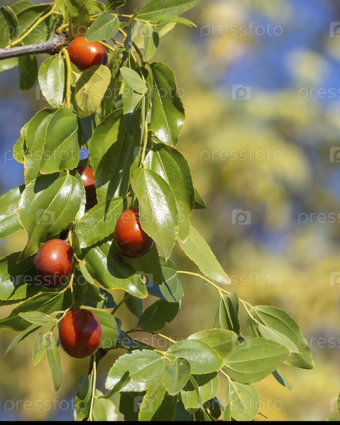 Спелые плоды унаби среди зеленой листвы на ветке дерева. Плоды мармелада. Зизифус ююба. Зрелые сочные ягоды мармелада среди зеленой листвы