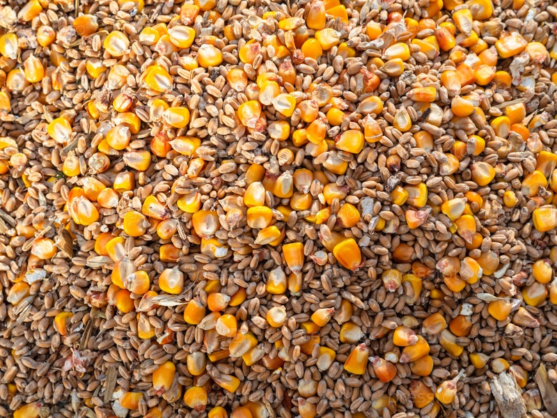 Естественный фон семян пшеницы и золотой кукурузы (кукурузы). Кормовая зерновая смесь. Зерна пшеницы и кукурузы (кукурузы) на корм животным и птицам. Натуральный тип зерновой смеси с натуральным мусором