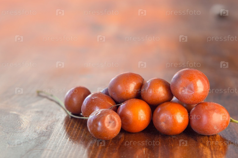 Мармелад-мармелад или китайский финик на деревянном фоне. Крупный план кучи спелых зизифусов, богатых витаминами и минералами, на деревянной поверхности. Малая глубина резкости. Спелые сладкие ягоды. мармелад