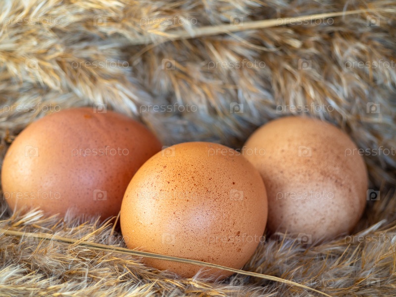 Коричневые яйца в гнезде из сена. яйца в сухой траве на эко-ферме. Крупный план красных органических куриных яиц фокусируется на малой глубине резкости переднего плана