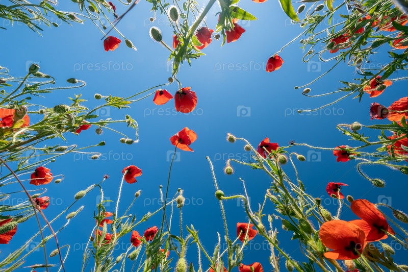 Вид снизу на красные маки и голубое небо